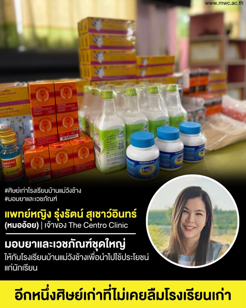 คุณหมอรุ่งรัตน์ และ The Centro Clinic ขอร่วมเป็นส่วนหนึ่งในการส่งต่อความห่วงใย ด้วยการมอบยาและเวชภัณฑ์ให้กับน้องๆ โรงเรียนบ้านแม่วังช้าง เพื่อนำไปใช้ดูแลสุขภาพของนักเรียน แม้จะเป็นเพียงส่วนเล็กๆ แต่ก็หวังว่าจะช่วยเติมรอยยิ้มและสร้างประโยชน์ให้กับเด็กๆ ได้ไม่มากก็น้อยค่ะ เพราะไม่ว่าจะผ่านไปนานแค่ไหน… “โรงเรียนเก่า” ก็ยังอยู่ในความทรงจำเสมอ